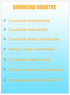 • Oferim clientilor nostrii, cea mai diversificata gama de servicii din domeniul curateniei. Echipele noastre, sunt formate din persoane instruite si atestate in domeniul serviciilor care includ curatenia. Materialele folosite de catre acestia, sunt cele mai bune de pe piata romaneasca, poate chiar internationala, iar instrumentele folosite in activitatile de curatenie, sunt de utilitate si intrebuintare doar pentru servicii profesionale.